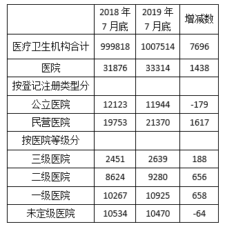 ×èÖ¹2019Äê7ÔÂ⣬£¬£¬£¬£¬£¬£¬Ò½Ôº3.3Íò¸ö£¬£¬£¬£¬£¬£¬£¬ÆäÖУº¹«Á¢Ò½Ôº1.2Íò¸ö£¬£¬£¬£¬£¬£¬£¬ÃñÓªÒ½Ôº2.1Íò¸ö¡£¡£¡£¡£¡£Óë2018Äê7ÔÂβ½ÏÁ¿£¬£¬£¬£¬£¬£¬£¬¹«Á¢Ò½ÔºïÔÌ179¸ö£¬£¬£¬£¬£¬£¬£¬ÃñÓªÒ½ÔºÔöÌí1617¸ö¡£¡£¡£¡£¡£